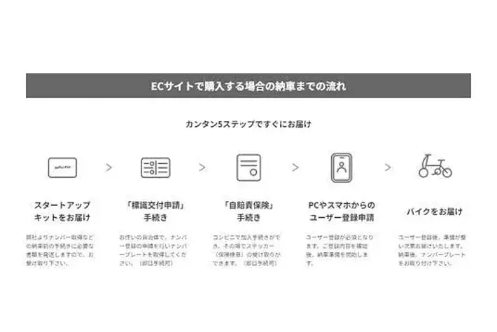 また、試行を重ねECサイトでは、ご注文後は「スタートアップキット」を先にお送りし、ナンバー登録と自賠責保険に加入後ユーザー登録で加入を報告いただき、それらを確認してから車両本体をお送りするなど、購入いただく方にも「電動バイクである」という事を認識いただいていただくスキームを独自に取り入れて運用するなど、交通ルールの遵守に販売側としても取り組んでまいりました。