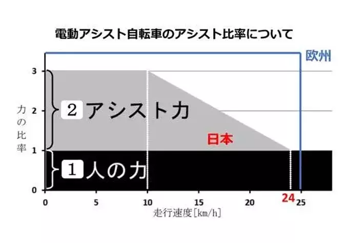 欧州などでは、日本のようなアシスト基準はなく、25km/hまで(国によってはそれ以上もある)漕ぐと無制限にスピードが出るものがあります。これらはECサイトなどで簡単に購入できますが、日本で利用する場合、このような違法アシスト自転車は自転車ではなく一般原付となる場合があります。