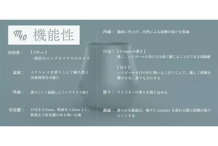 滑らかな曲面のフォルムにすることで、tumblerを傾けて丁寧に炭酸水を注いだ際に炭酸が抜けにくい効果が。また、内面を鏡面に仕上げ、凸凹による炭酸の抜けを低減。口元をわずかに反らせることで飲んだ時にハイボールが勢いよく流れ込み、ピリピリとしたきめ細やかな炭酸が口の中で上品に弾ける。さらに、耐久性に優れたステンレス製のtumblerは冷凍可能。冷凍庫でキンキンに冷やし、氷を使わずつくることで、最後まで薄まらずにハイボールを楽しめる。※自社独自基準の官能試験により、10分間は炭酸が抜けずに楽しめることを検証済み。