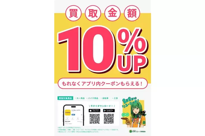 カー&バイク用品のリユース専門店「アップガレージ」を全国展開する株式会社アップガレージグループ(本社:神奈川県横浜市、代表取締役社長:河野映彦)は、2024年8月8日の「リユースの日」に合わせて、8月8日(木)~8月14日(水)の1週間限定で買取金額10%UPキャンペーンを実施いたします。