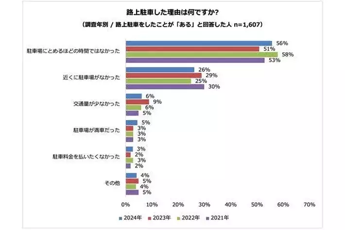 路上駐車をした理由は、「駐車場にとめるほどの時間ではなかった」が56%で最多でした。次いで、「近くに駐車場がなかった」26%、「交通量が少なかった」6%と続いています。路上駐車の経験者比率が3割を下回っている過去3年の結果と比較しても、傾向に変化は見られませんでした。