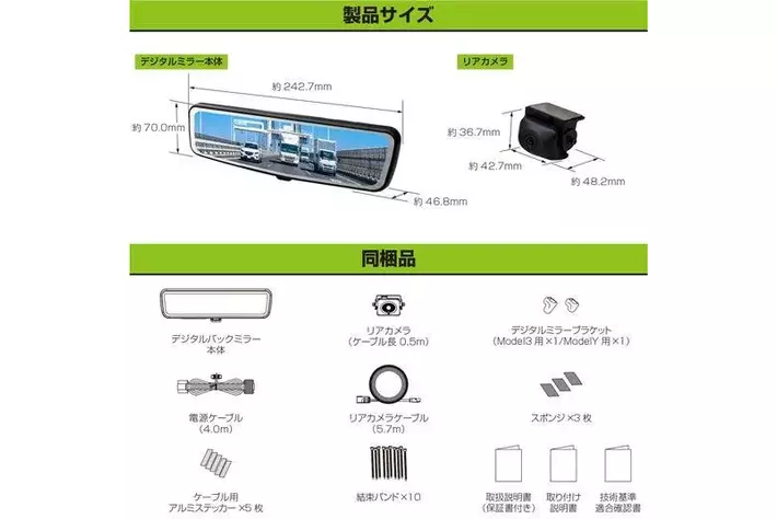 デジタルミラー本体、電源ケーブル(2.0m)、