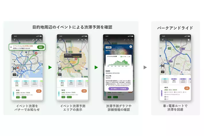本機能では、多くの人出で賑わうイベント時の周辺道路の渋滞予測エリアを事前に確認できるようにしたり、回避するルートを提案することで、花火大会やお祭りといったイベントを快適に楽しんでいただける一助となればと思い、開発いたしました。空いている時間帯に移動するオフピーク走行や渋滞回避をサポートすることで、会場付近の交通分散にも貢献いたします。