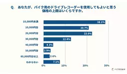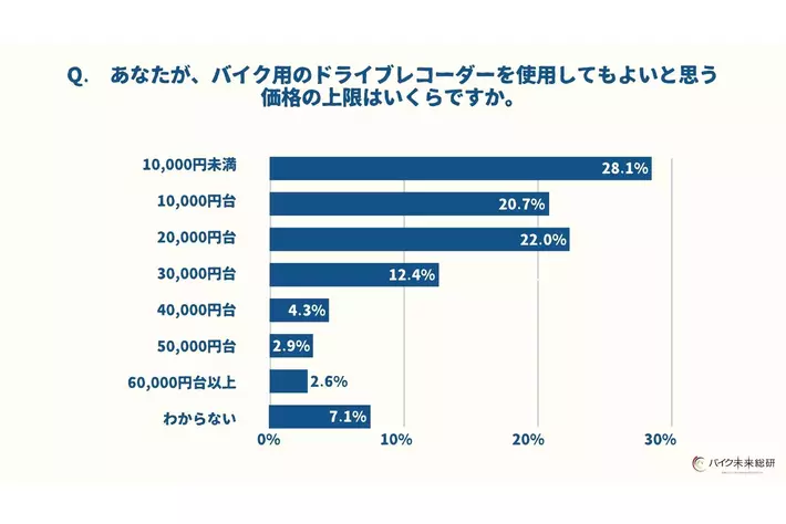 「バイク用のドライブレコーダーを使用してもよいと思う価格の上限」の設問では、「1万円未満」と回答した人が28.1%と最も多い結果となりました。