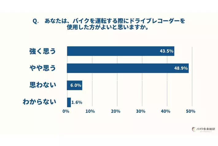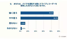 その一方で「バイクを運転する際にドラレコを使用した方がよいと思いますか」の設問では「強く思う」「やや思う」と答えた人を合わせると92.4%を占める結果となりました。