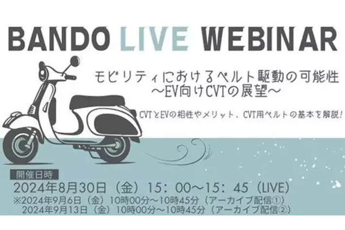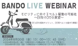 バンドー化学株式会社(本社:兵庫県神戸市)は、ウェビナー「モビリティにおけるベルト駆動の可能性~EV向けCVTの展望~ 」を開催いたします。
