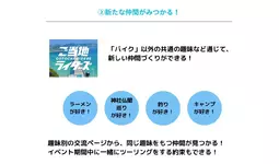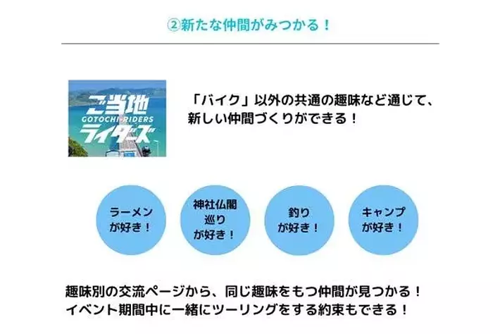 一緒に走る仲間を見つけたり、ご当地やバイクに関する情報交換などを通じて交流が楽しめます。