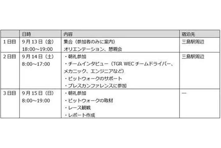 FIA 世界耐久選手権 以下 WEC)に参戦する TOYOTA GAZOO Racing(以下 TGR)は、こどもの職業・社会体験施設「キッザニア」の企画・運営を行う KCJ GROUP 株式会社(以下 KCJ GROUP)による監修のもと、2024 年シーズン WEC 富士 6 時間耐久レースにおいて、中学生を対象に、キッザニアの街を飛び出して実社会の仕事を体験できるプログラム「Out of KidZania TOYOTA GAZOO Racing~レーシングチーム広報スタッフの仕事~」を、2024年9月13日(金)から9月15日(日)まで(※)開催します。つきましては、8月2日(金)から参加受付を開始します。