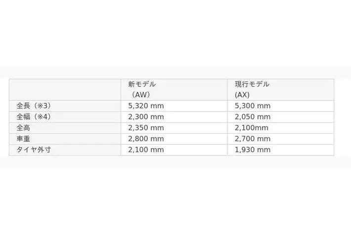 新モデル(AW)では、EVの充電可能な車種を増やすにあたり、充電時に突起する充電リッド(ふた)や充電ケーブルなどの給電部分の寸法にも配慮し、駐車スペースを拡大しました。