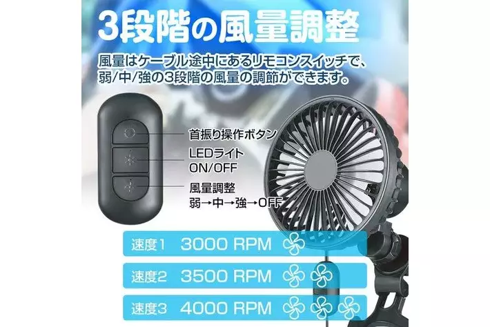 風量調整は、ケーブル側のスイッチで強/中/弱の3段階調整が可能で、シーンに合わせてお選びいただけます。