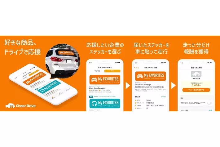 個人のクルマに好きな商品などの応援ステッカー貼ってドライブすることで、走行距離に応じてスポンサー収入や特典を獲得できる車体を活用したシェアリングエコノミーサービスです。会員登録からキャンペーンのお申し込み、走行距離の確認、走行完了申請、ポイント・特典の獲得までスマホアプリで手軽に完結することできます。2021年3月にサービス開始、現在登録会員数5万人を抱え、幅広いジャンルの多彩な応援キャンペーンを展開しています。
