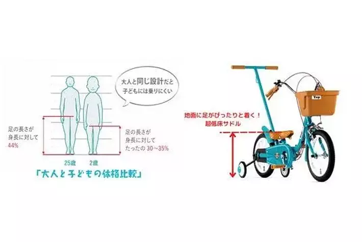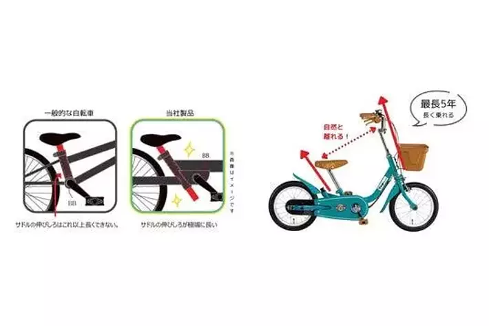 一般的な幼児用自転車は、成長に伴いサドルのみを高くすると、膝とハンドルが近くなるため漕ぎにくい姿勢になってしまいます。