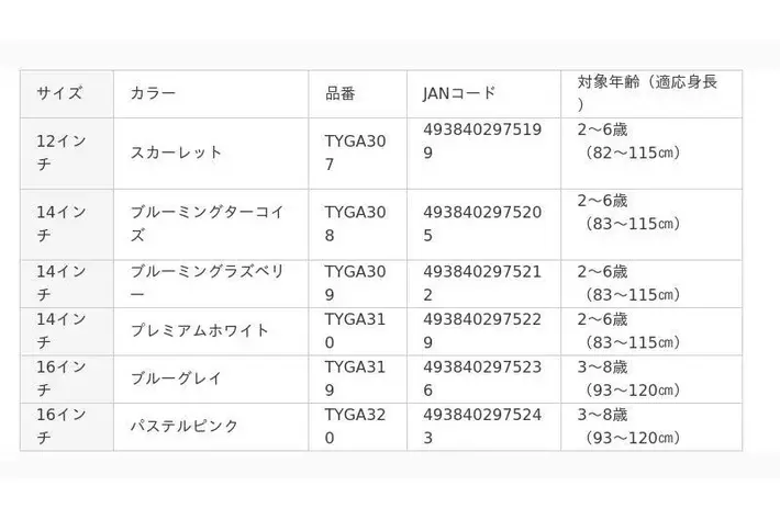 12・14インチは「2~6歳」、16インチは「3~8歳」を対象年齢としています。