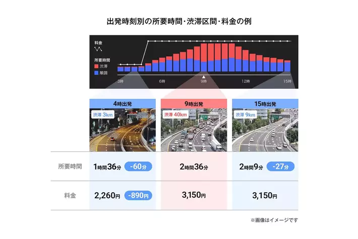~出発時刻を変更した場合の予測所要時間と料金をグラフで表示。オフピーク走行で渋滞回避を実現~