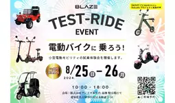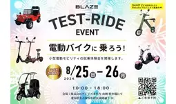 株式会社ブレイズ(愛知県名古屋市、代表取締役:市川秀幸、以下ブレイズ)は、2024年8月25日(日)・26日(月)に、ブレイズ名古屋本社にて、新商品「スマートEV 特定原付モデル」をはじめとする弊社の小型電動モビリティ商品の試乗会および展示車両即売会を開催いたします。