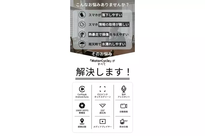 スマホのアプリをバイクでも使用可能!CarPlay/Android Auto対応5.5インチバイク用ディスプレイオーディオ「MotorCycle」