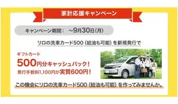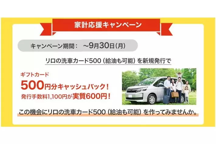 リロクラブでは新登場の「リロの洗車カード500」を記念して、“家計応援キャンペーン”を2024年9月30日(月)まで実施いたします。
