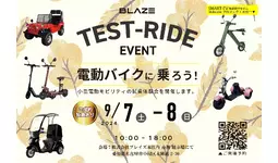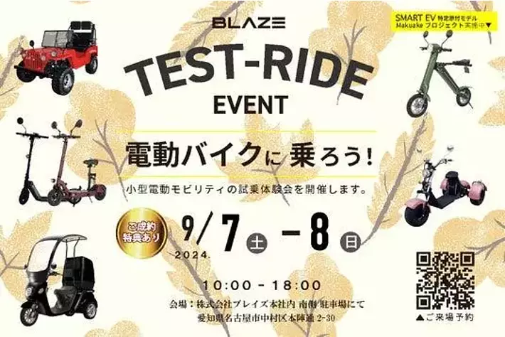 株式会社ブレイズ(愛知県名古屋市、代表取締役:市川秀幸、以下ブレイズ)は、2024年9月7日(土)・8日(日)に、ブレイズ名古屋本社にて、新商品「スマートEV 特定原付モデル」をはじめとする弊社の小型電動モビリティ商品の試乗会および展示車両即売会を開催いたします。
