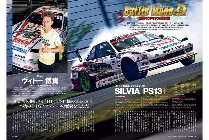 競技スペックのドリフトマシンのスペックをチェックする『Battle Mode D』。連載8回目は、D1ライツ仕様からD1GP仕様へのステップアップを果たした、ヴィトー 博貴のPS13シルビアに迫る。