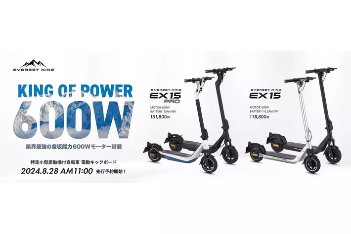 同のブランド600Wモーター搭載の特定小型原動機付自転車電動キックボード2機種:600W48Vモデル「EX15 PRO」と、600W37Vモデル「EX15」も2024年8月28日(水)より先行予約販売中です。