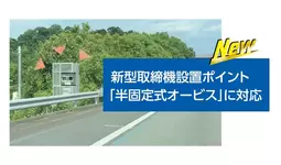 主に高速道路の路肩に設置されている「半固定式オービス」、一般道のゾーン30エリアに設置されている新型取締機設置ポイントの1km手前と500m手前で警告します。