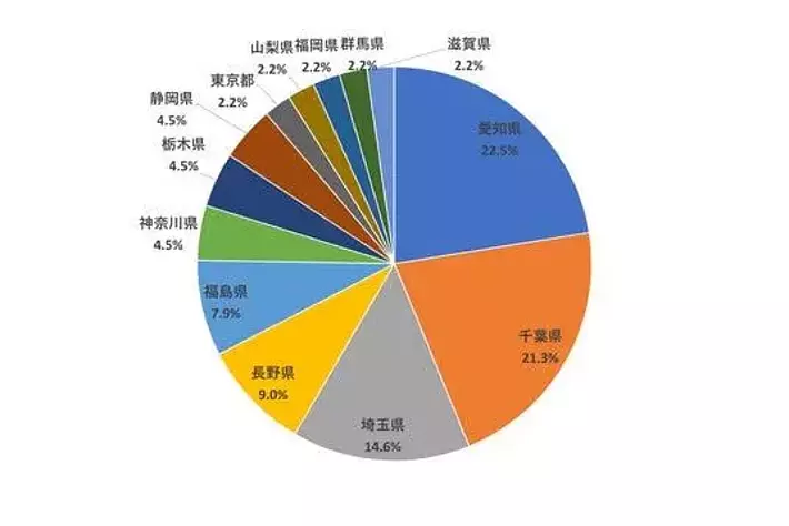 都道府県別で見ると、愛知県が22.5%と最も多いです。トヨタ自動車の本社もあり、自動車産業が盛んなためと考えられます。