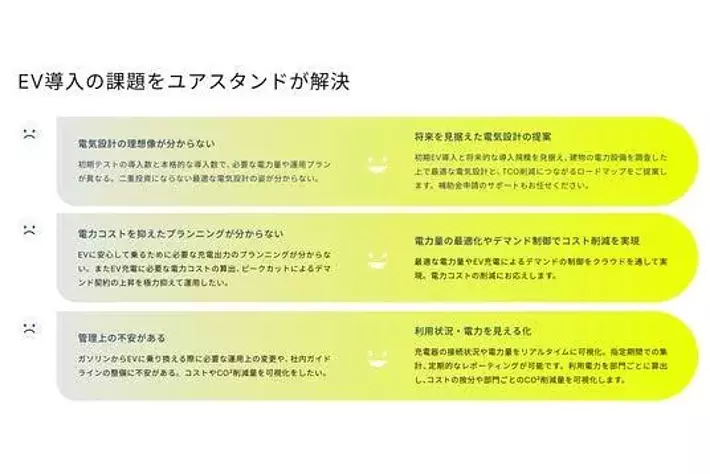 ユアスタンド株式会社(以下 ユアスタンド:東京都品川区 代表取締役社長 浦 伸行)は法人向けのEV充電管理システム「Yourstand for Business」のサービス提供の開始をお知らせいたします。