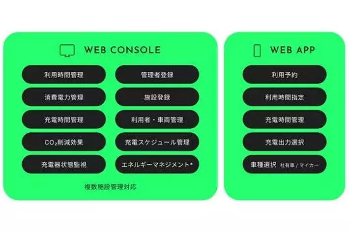 WebコンソールではPCからの「管理機能」として、充電スケジュール管理や充電の状態監視の運用管理を一元化。消費電力やCO2削減効果など、全社規模から車両・部署単位でのサマリーレポートを確認でき、実績確認を容易にします。