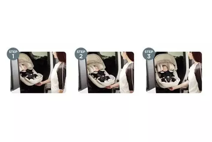 本製品はシートとベースが分離したセパレート型のチャイルドシートです。ベースを設置後にシートを取り付ける仕様で、シートは横からスライドしてベースに付け外しするため、車内に体を大きく入れずに取り付けられます。また、シートとベースが分かれていることで重さも約半分になり、車内に持ち込みやすくなりました(当社従来品比)
