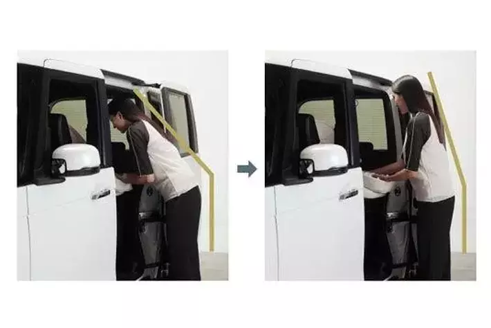 従来品から継続の360°回転シートは、新機構によりドア側に100mmスライドすることが可能に。シートの位置が近づき、乗せ降ろしする際の無理な姿勢を解消。これにより、腰への負担を14%軽減(スライド前後を比較した当社による算出)。車内に入り込まずに乗せ降ろしできるため、頭をクルマの天井にぶつける不安も軽減されます。また、スライド後に左右30°ずつスイング※するため、シートを引き出した時にドアが邪魔になるような場合も、乗せ降ろししやすい向きへシートを調節することが可能です。