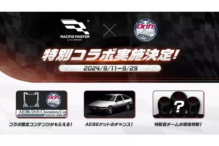 『レーシングマスター』は、この「AE86 Drift Champions Cup ~AE86日本一決定戦~」とコラボを実施。2024年9月11日~29日の期間中、ゲーム内の指定ミッションをクリアすることで、限定コラボステッカーとAE86アイコンをゲットできます。