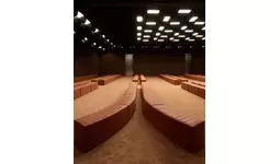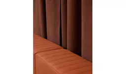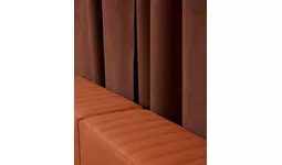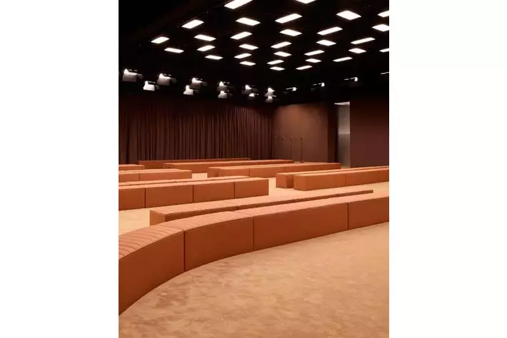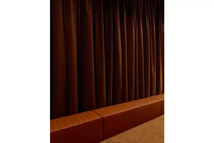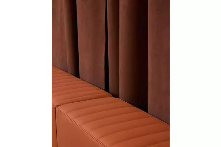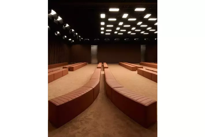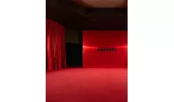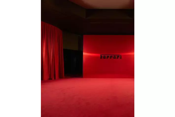 ブランドのDNAに完全に一致する形で、イアンノーネ氏はALCANTARA(R)を用いて、温かみがあり親密な空間を創り出しました。この空間は、まるでALCANTARA(R)で内装されたスーパーカーの中からショーを楽しんでいるかのような没入感を提供する設計となっています。ゲストを迎えるのは、アイコニックな「Rosso Corsa」のカーテンであり、「Oud」色のインスタレーションがショーを引き立てています。