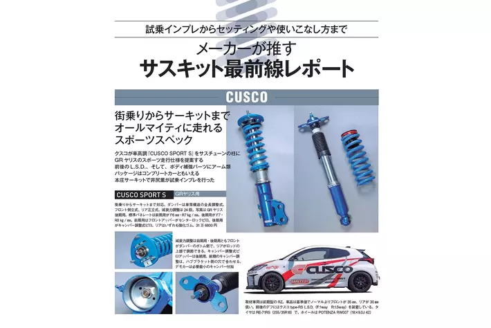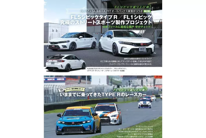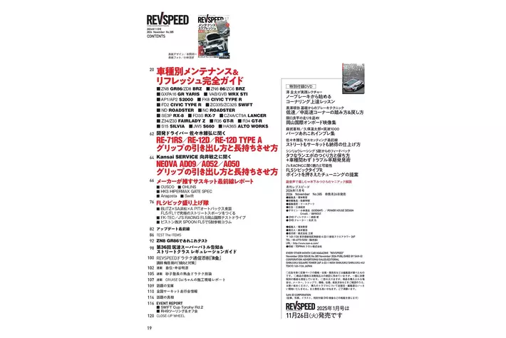 誌面特集は『車種別メンテナンス&リフレッシュ完全ガイド』です。ZN8 GR86/ZD8 BRZ、 ZN6 86/ZC6 BRZ、GXPA16 GR YARIS、VAB/GVB WRX STI、AP1/AP2 S2000、FK8/FD2 CIVIC TYPE R、ZC33S/ZC32S SWIFT Sport、ND/NC ROADSTER、SE3P RX-8、FD3S RX-7、CZ4A/CT9A LANCER EVOLUTION、Z34/Z33 FAIRLADY Z、R35/R34 GT-R、S15 SILVIA、JW5 S660、HA36S ALTO WORKS/HA36V ALTOについて精通しているチューナーにアドバイスをいただきました。中古車購入の参考書にもなります。小特集は『FLシビック チューニング最前線』『POTENZA/ADVANタイヤ グリップの引き出し方と長持ちさせ方』『最新サスキット テストレポート』の3本です。