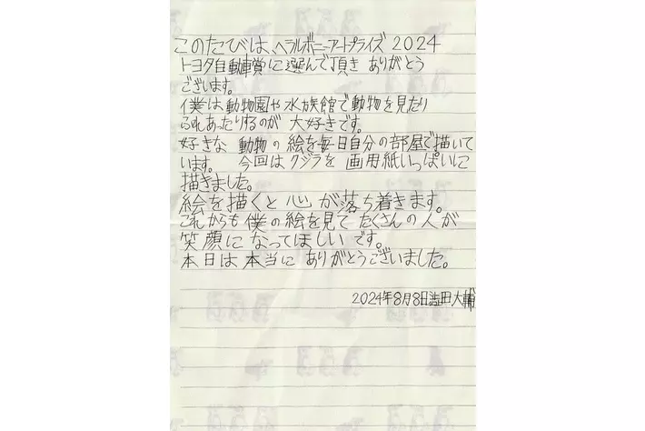 今回「トヨタ自動車賞」を受賞した澁田大輔氏より、HERALBONY Art Prize 2024授賞式にて受賞コメントとして読まれた手紙をいただきました。