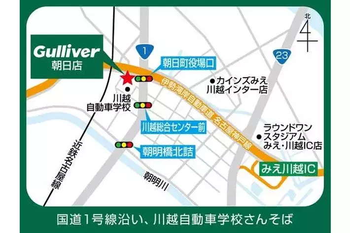 国道1号線と北勢バイパスの交差点、伊勢湾岸自動車道付近に位置し、近隣には商業施設や娯楽施設などが集まる場所のため、朝日町内だけではなく北勢地域の皆様にお立ち寄りいただきやすい立地となっております。