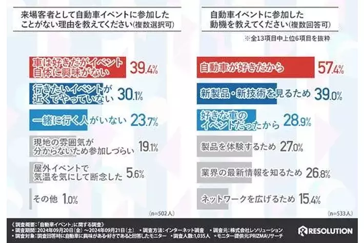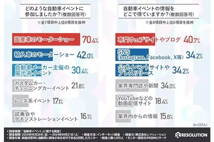 株式会社レソリューション(本社所在地:東京都千代田区、代表取締役:廣谷 旭)は、自動車に興味がある・好きである方を対象に、「自動車イベント」に関する調査を実施しました。