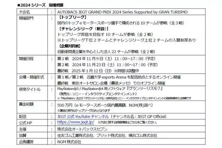株式会社オートバックスセブン(代表取締役 社長:堀井勇吾)は、eモータースポーツの公式大会「AUTOBACS JEGT GRAND PRIX 2024 Series」を2024年11月9日(土)より開幕することをお知らせします。