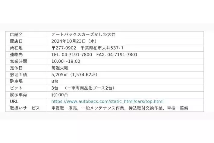 株式会社オートバックスセブン(代表取締役 社長:堀井勇吾)は、2024年10月23日(水)に、オートバックスグループの車買取・販売店「オートバックスカーズ」初の大型店「オートバックスカーズかしわ大井」を千葉県柏市にオープンします。
