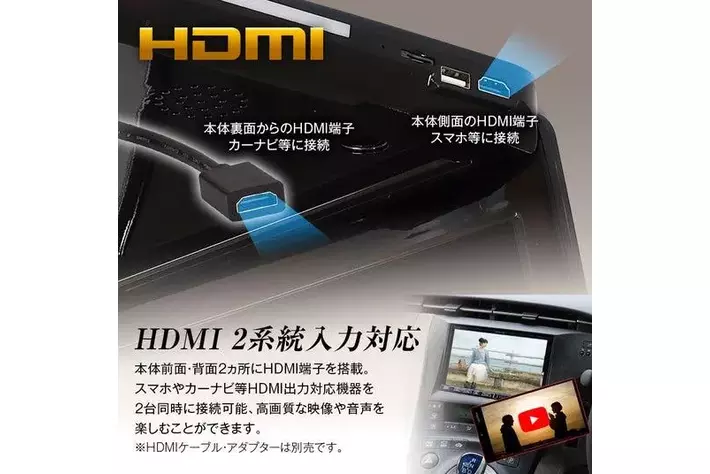 本体側面・裏面2ヵ所にHDMI端子を搭載。スマホやカーナビ等HDMI対応機器の2台同時に接続可能、高画質な映像や音声を楽しむことができます。もちろんアナログ端子のRCAも接続可能。従来のDVDプレーヤーなども接続いただけます。