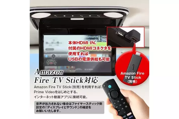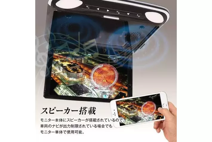 モニター本体にスピーカーが搭載されているので、車両のナビが出力制限されている場合でもモニター単体で使用可能。HDMI+スピーカーでスマホの動画やFire TV Stick等にも対応。