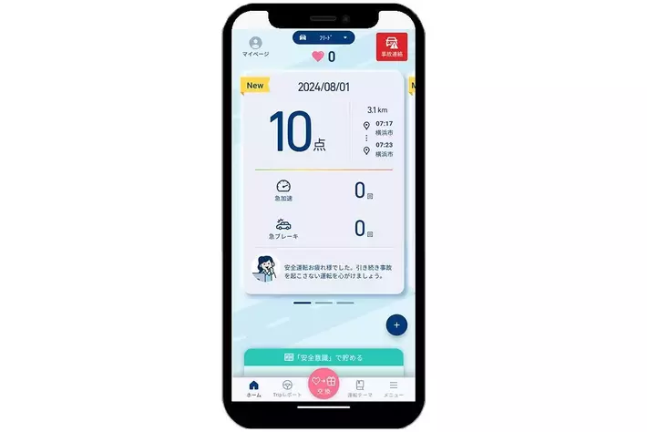 アプリには、万一の事故時に衝撃を検知し、スムーズに連絡ができる「1タップ事故連絡」を搭載しています。また、運転データをスコア化する機能や安全運転を意識することでコーヒーなどと交換できる安全運転支援サービスが特長です。