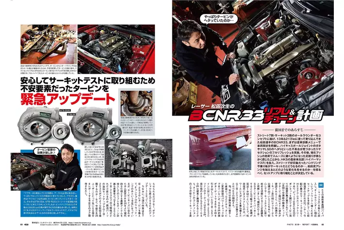 不定期連載でお届けしている松田次生選手の愛機、BCNR33のリフレッシュ&チューニング企画。今回は装着したHKS最新の車高調『ハイパーマックスR』をテストする予定だったが、事前のチェックやテスト走行で不安要素とされていたタービンのアップデートに着手することに…。筑波1分切りの足掛かりとなるか!?