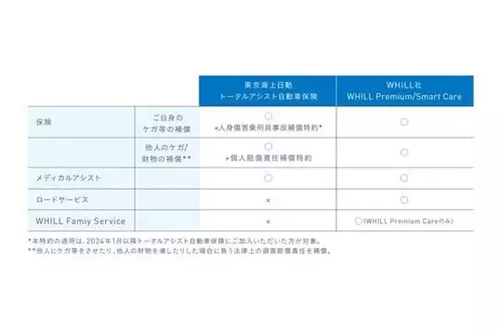 ◼️トータルアシスト自動車保険とWHILL社専用のサポートサービス 内容比較