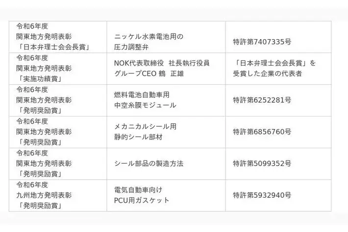NOK株式会社(本社:東京都港区芝大門、代表取締役 社長執行役員 グループCEO:鶴 正雄、以下「NOK」)は、公益社団法人 発明協会が主催する「令和6年度関東地方発明表彰」において、ハイブリッド車のバッテリーの電池内圧力を調整する「ニッケル水素電池用の圧力調整弁」が「日本弁理士会会長賞」を初受賞いたしました。また、本発明を実施した企業の代表者として鶴グループCEOが「実施功績賞」を受賞しました。