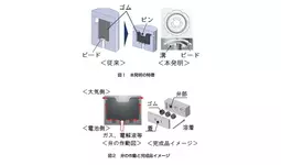 ニッケル水素電池の過放電・過充電により発生するガス等を排出し、電池内の圧力を調整する弁の発明です。本発明では、弁の蓋にピンをつけることで、溝をつくり、ゴムを加圧し薄くした新しい構造が特徴です(図1)。この溝がゴムの加圧で生じる開弁圧の上昇を防ぎ、ゴムを薄くすることで圧縮の変動による荷重が低減されます。そのため、ゴムの圧縮で発生する荷重で開弁性能を確保する構造の圧力調整弁よりも、排出性能を維持しながら、開弁性能のばらつきが抑えられます。