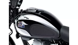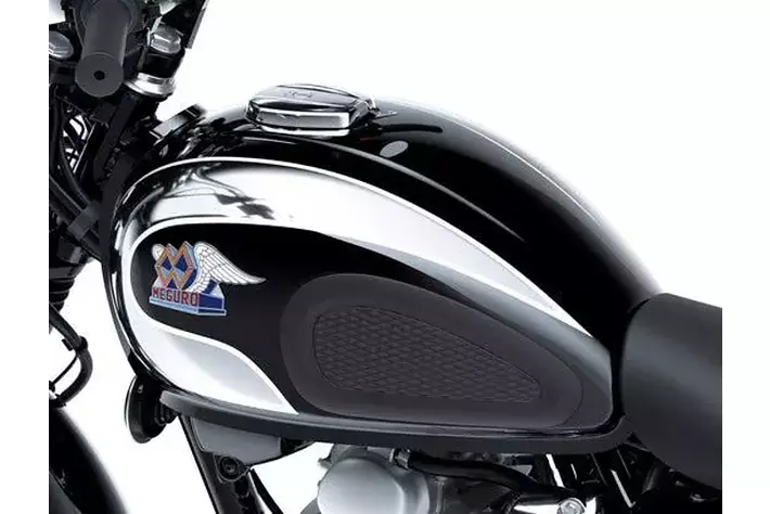 ・エボニーとクロームメッキで仕上げられたティアドロップ型フューエルタンクと、MEGUROの誇りを示す立体エンブレム