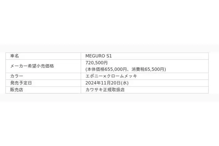 株式会社カワサキモータースジャパン(本社:兵庫県明石市、代表取締役社長:佐伯 健児)は、1964年に発売され、メグロとカワサキの両ブランドを冠した「カワサキ250メグロSG」の精神を受け継ぐモデルとして、新たに「MEGURO S1」を2024年11月20日(水)に新発売いたします。