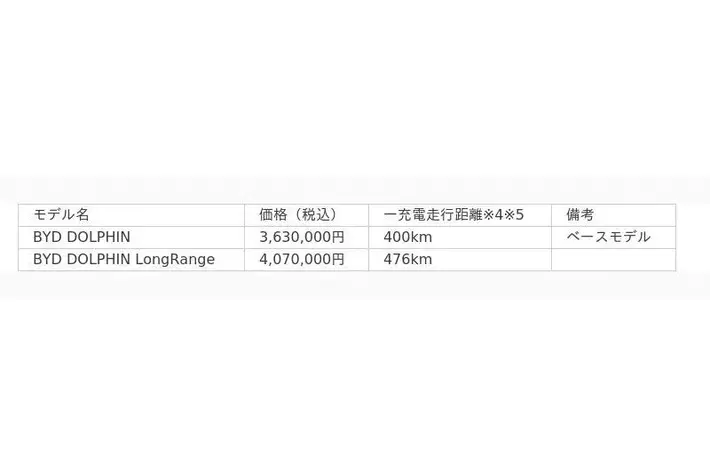 今回BAJが新たに導入するのは、記念限定車の「BYD DOLPHIN Baseline」と特別仕様車の「BYD DOLPHIN Limited」「BYD DOLPHIN Long Range Limited」の3モデルです。とくに記念限定車のBYD DOLPHIN Baselineは、国内で輸入登録されている乗用の電気自動車(以下:BEV)としては初めて(※1)300万円を切る価格に設定しました。