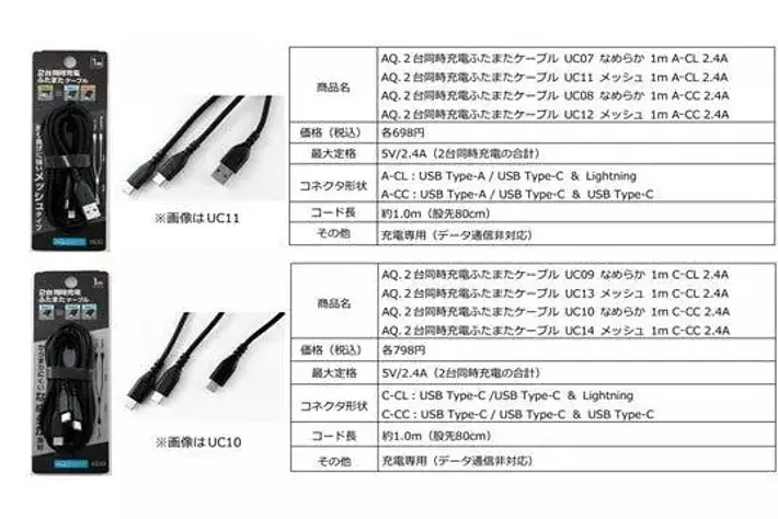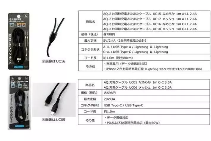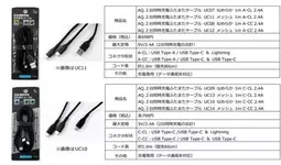 ケーブルは全14タイプをそろえ、1本で2台同時に合計2.4Aで充電できる二股タイプと、USB Power Delivery(*1、以下PD)に対応している1本タイプがあります。ケーブルは束ねても絡まりにくいなめらか素材と、繰り返しの折り曲げや伸ばしに強いメッシュ素材の2種類をラインアップ。