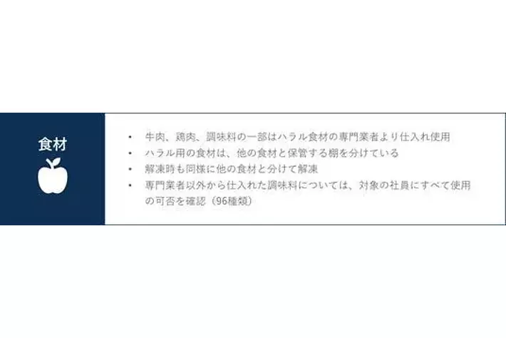 提供開始前には食堂運営会社の株式会社グリーンハウスと共に、ハラルジャパン協会によるハラル対応に関する教育訓練を受講し、訓練を受けた者が調理を担当。また、これまで食堂で提供したことのある約400種類の一般社員向けメニューのハラル可否の確認を行いました。さらに、現状の厨房をハラル対応にするためのアドバイスを受け、厨房は一般調理エリアと共用なものの、食肉はハラル食材の専門企業から仕入れたものを使用し、コンタミネーションを防ぐため保管場所を分け調理は最初に行うなど「ムスリムフレンドリー」と呼ばれるレベルでハラルメニューを提供しています。